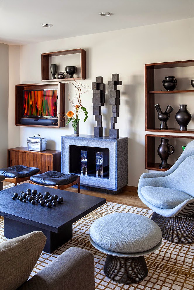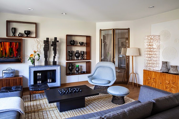 Интерьер гостиной украшает сразу несколько великолепных образцов винтажной мебели середины прошлого столетия и коллекция художественной керамики. В дизайне прослеживается четкий геометрический ритм, характерный для стиля Атр Деко: прямоугольные полочки из дерева идеально повторяют форму камина, строгий диван и квадратный журнальный столик, миниатюрные шкафчики, низкие табуреты и даже ковер в золотистую клеточку.