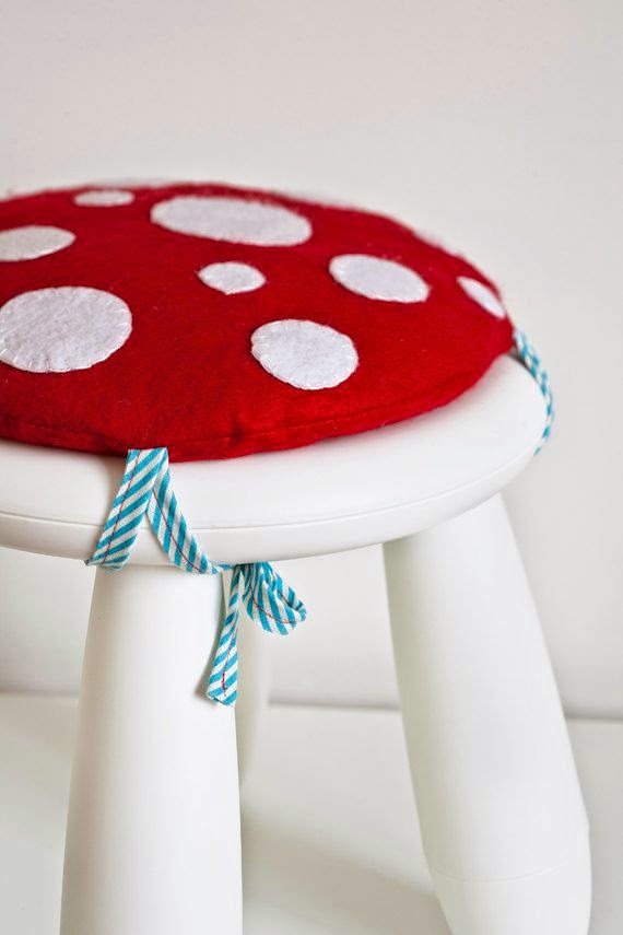 Красные с белыми горошинками мягкие подушечки на детских табуретках делают его похожим на мухомор, создавая тем самым атмосферу игры и сказки. Оригинальные подушки ручной работы и пуфики с таким ярким принтом украсят интерьер малыша, стимулируя творческое воображение.