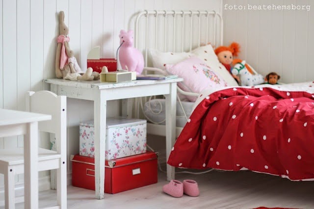 У каждой девочки должно быть пастельное белье красное в белый горошек — это же так здорово и поднимет настроение даже папе! Если вы хотите обновить интерьер детской, не затрачивая лишних средств, то можно сделать мягкое изголовье, обшитое этим модным принтом. Добавьте подушечки, текстиль и аксессуары в цвет — и вот новый чудесный и стильный интерьер «принцессы на горошине» готов!
