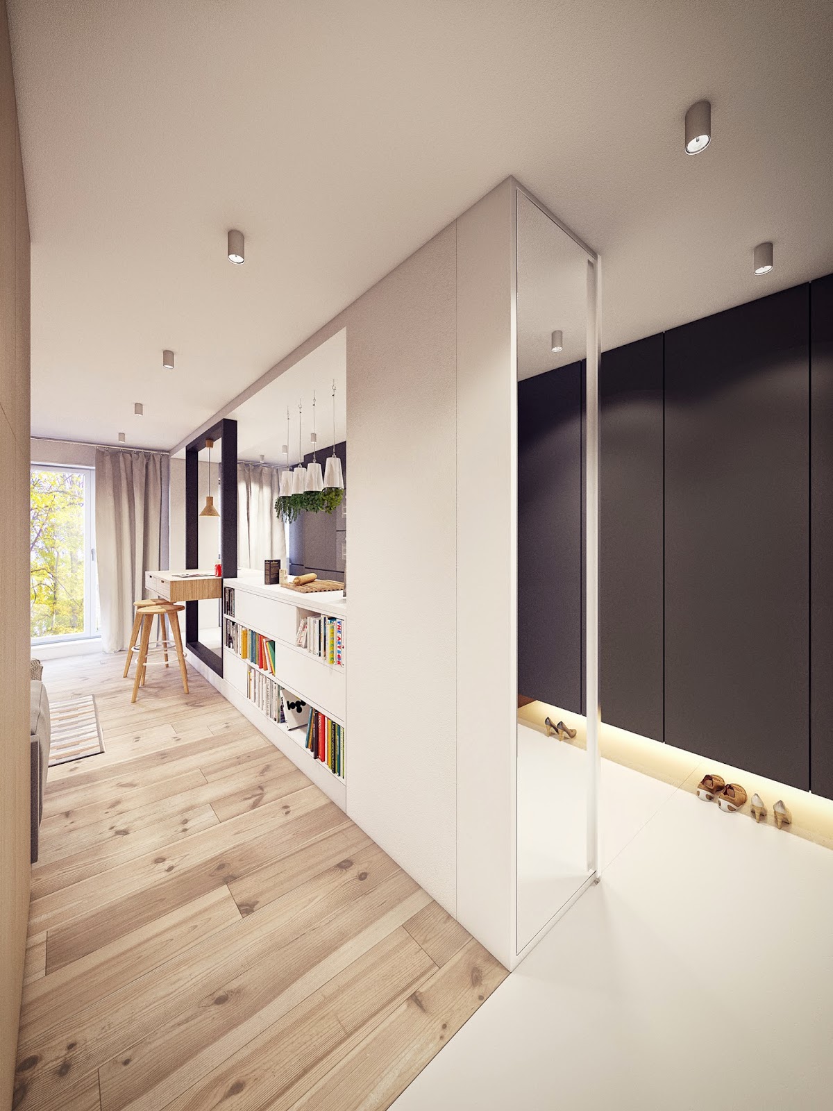 Особенно привлекает внимание оригинальная барная стойка, объединяющая зону кухни и гостиной. Модуль столешни из дерева словно подвешен в прямоугольной раме, создавая иллюзию зеркала и расширяя узкое пространство кухни.