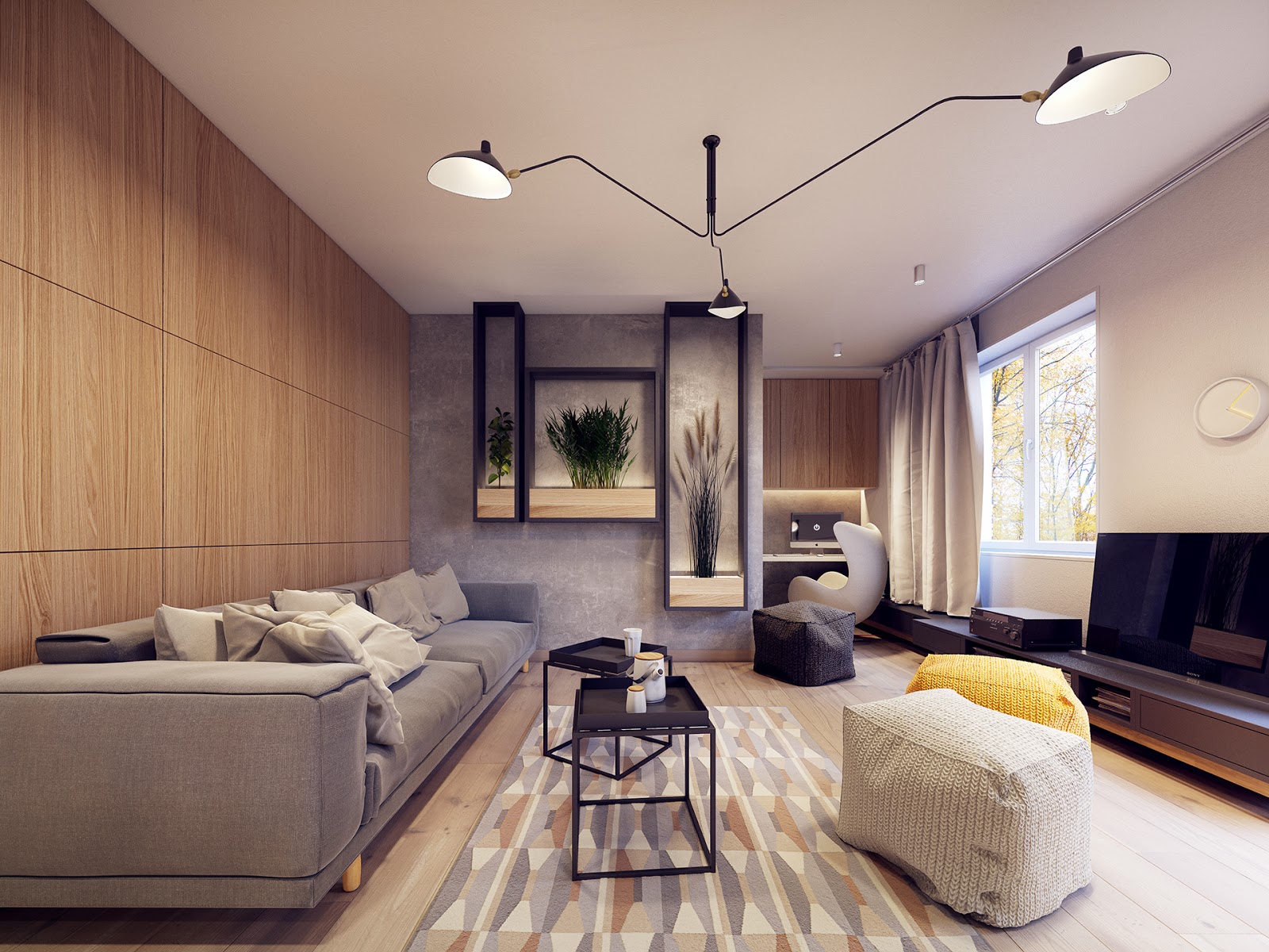 Современный интерьер квартиры в стиле 60-х, разработанный студией Plasterlina, построен на контрастах темного и светлого дерева, который одновременно успокаивает и создает необходимое уединение в открытом пространстве кухни-гостиной. Благодаря креативному подходу дизайнерам удалось решить проблему небольшой квартиры, разделив ее на уютные и функциональные зоны кухни, гостиной и рабочего кабинета.