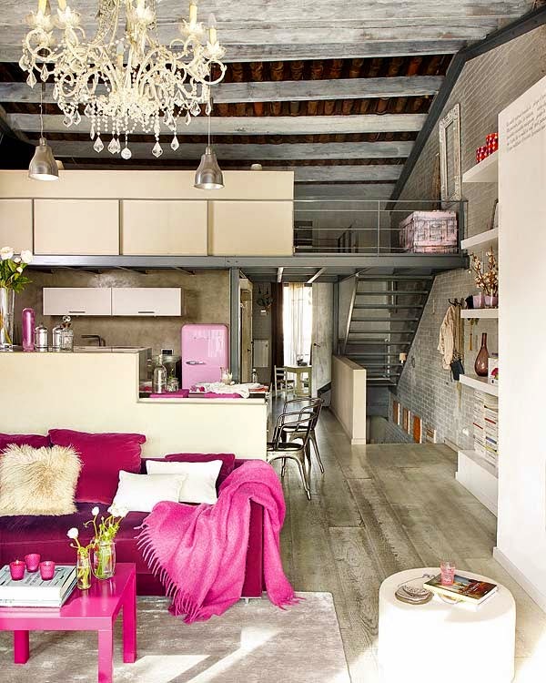 Нежные оттенки фиолетового и розового превращают холодный интерьер и индустриальный лофт в Барселоне в прекрасное женское царство.