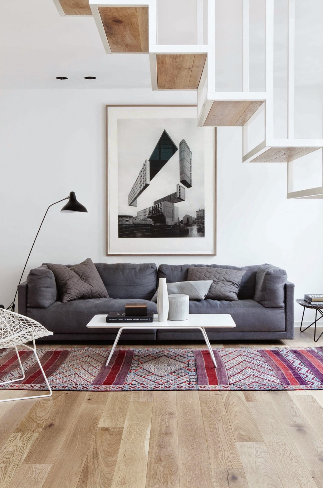 Минималистичный черно-белый интерьер гостиной украшает яркий половик с национальными скандинавскими узорами, как дань традициям и реликвия из прошлого века.