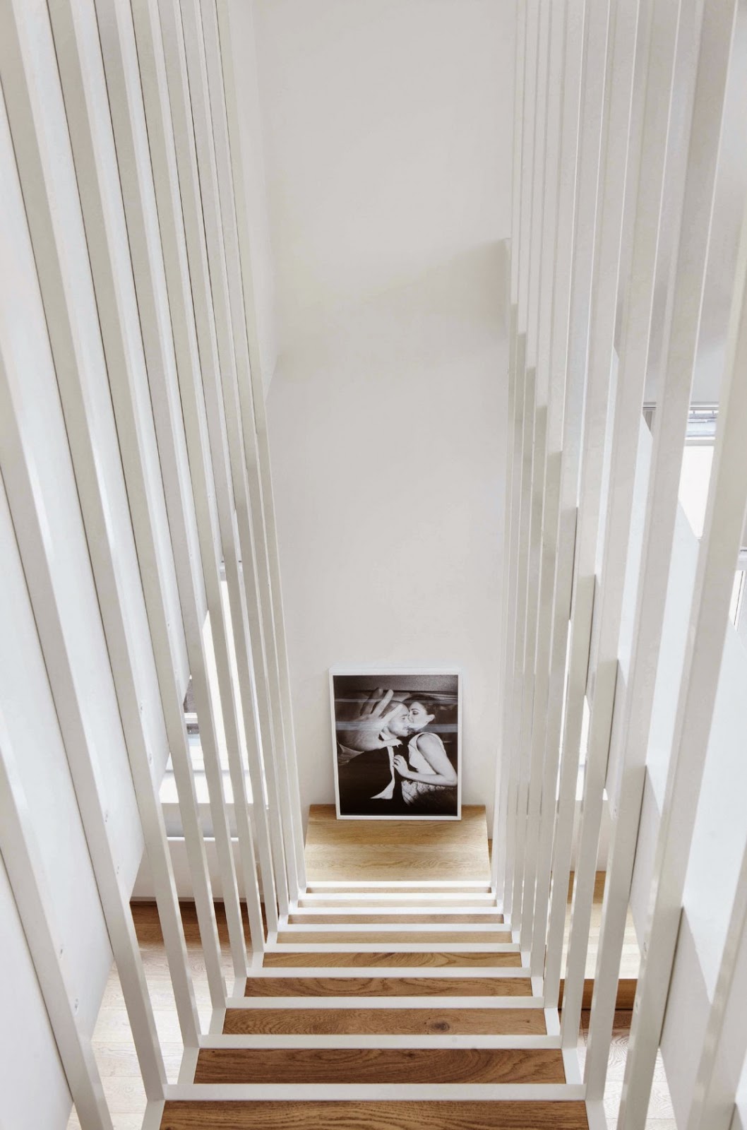 Конструкция лестницы является главным элементом архитектуры и перекликается с белыми потолочными балками. Пришлось пожертвовать помещением чердака, чтобы создать эффектное двойное пространство над гостиной и кухней.