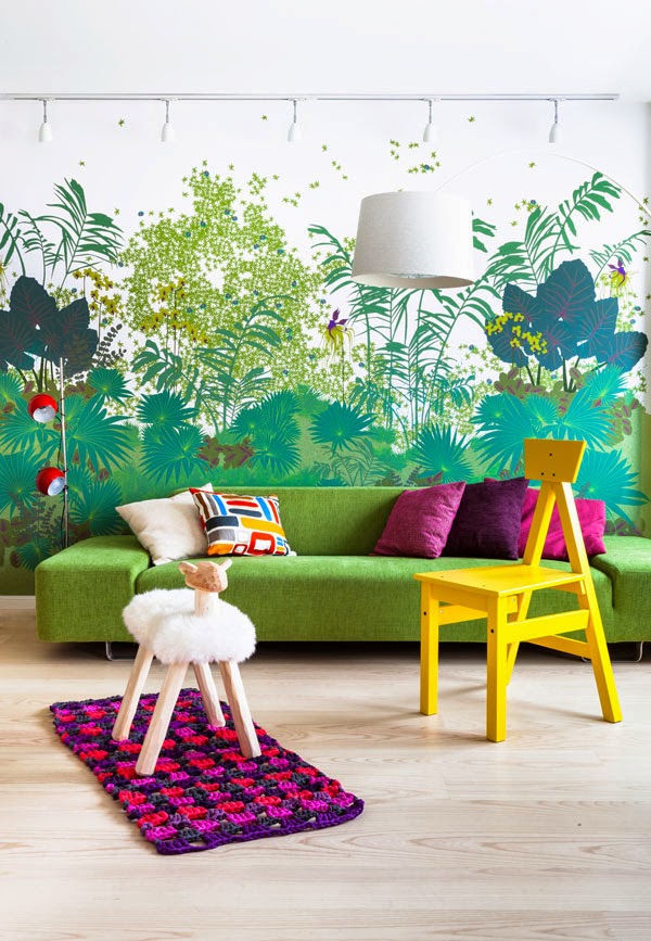 Итальянский дизайнер Maurizio Giovannoni смело объединил строгий скандинавский стиль и южный колорит в своем проекте. Не сложно заметить, что дерево является вездесущим элементом в этом интерьере: светлые полы из ясеня, перегородка из реек и современная мебель из березы, но главным акцентом, конечно же, стали красочные обои природной тематики от Conceptuwall и зеленый диванчик мебельной марки SOPE.