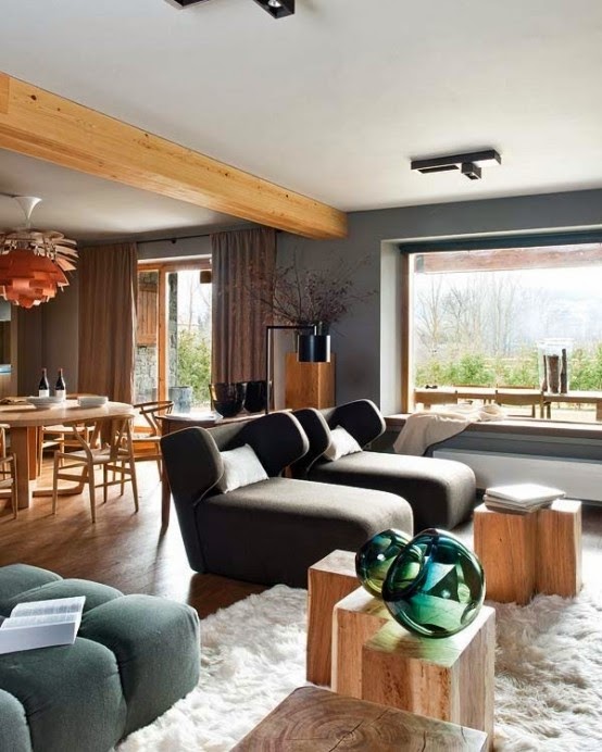 Грубые деревянные балки, бетонные стены, винтажная мебель из дерева и мягкий бархат диванов — эти выразительные контрасты в материалах, форме и цвете создают невероятно стильный и комфортный интерьер загородного дома, который согреет в холодные зимние дни и подарит прохладу знойным летом.
